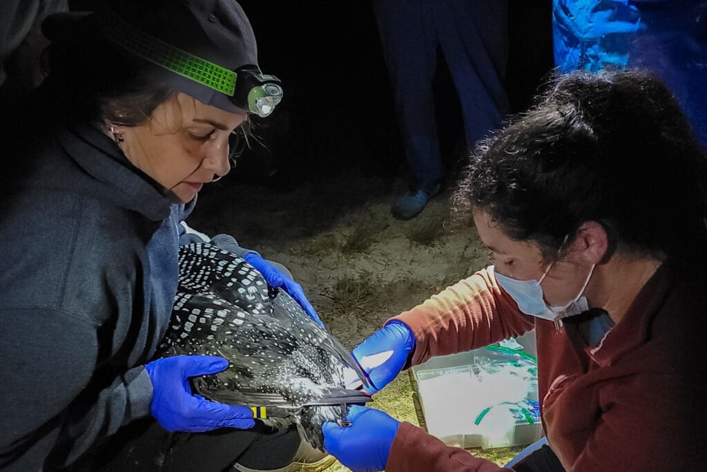 In the photo below (thanks to Charlene Baxter). Caroline Hughes (right), Biologist and Outreach Coordinator, is applying a band while Ashley Keenan (left), Field Program Coordinator, holds Papa.