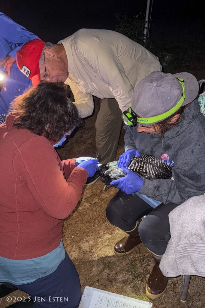 Below, Doug Baxter, president of PLPA, is holding a light for Caroline while she takes a blood sample. Blood tests will help reveal the health of the Loon and the presence of any toxins he may have been exposed to on the lake. They also take two feathers. The Loon’s summer plumage comes in before they arrive at Pleasant Lake, so anything they learn from these samples will be indicative of the environment on the ocean.