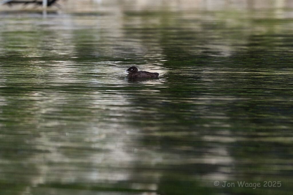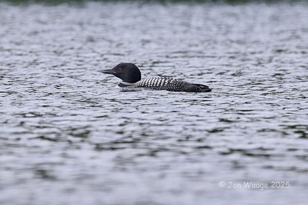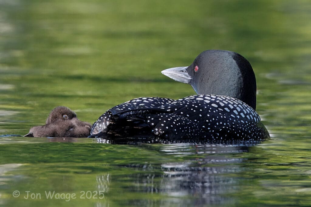 For a while yet, Piper will be small enough to ride under her parents’ wings. The loon below was at mid-lake. Piper is under his wing. Had he needed to dive to avoid a boat, Piper would have quickly ended up on the surface!